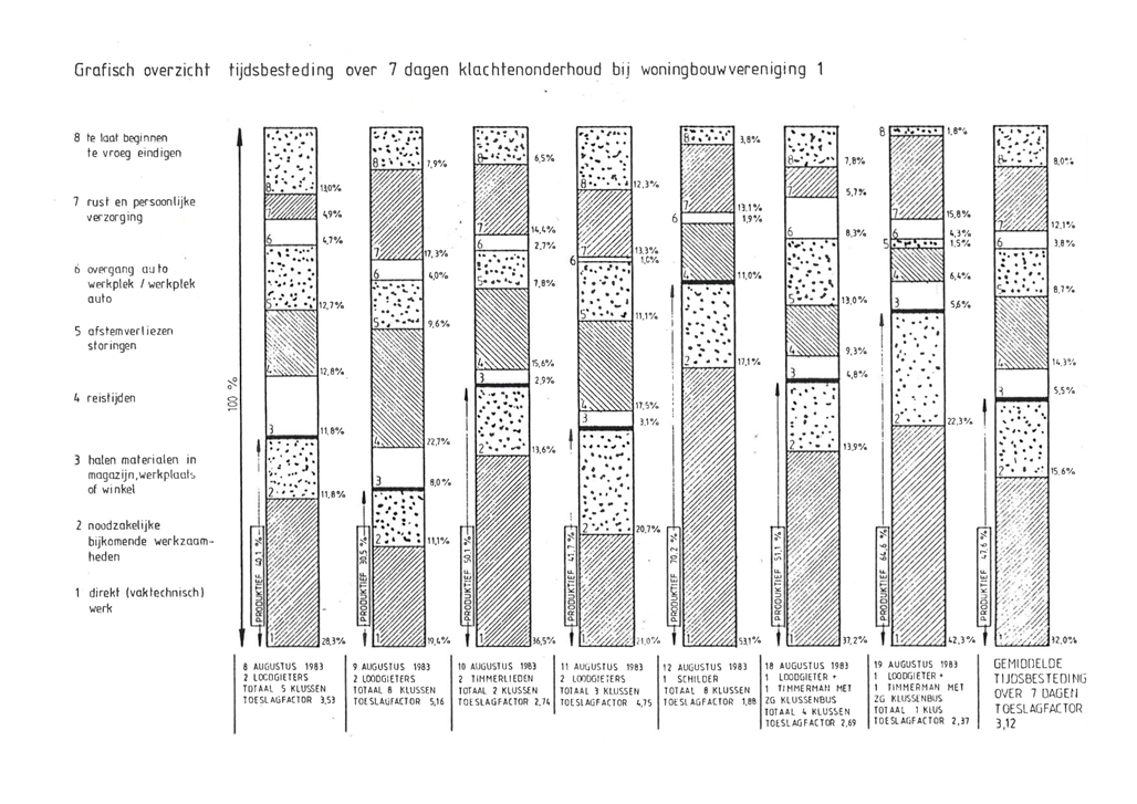 Afbeelding 1: een prachtig overzicht uit een collegedictaat van de Technische universiteit Eindhoven uit de jaren zeventig over ‘renovatie & industrialisatie’ dat laat zien waar de verloren (productieve) uren van een werkdag zitten.
